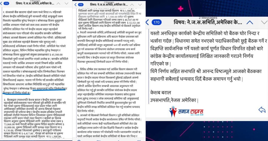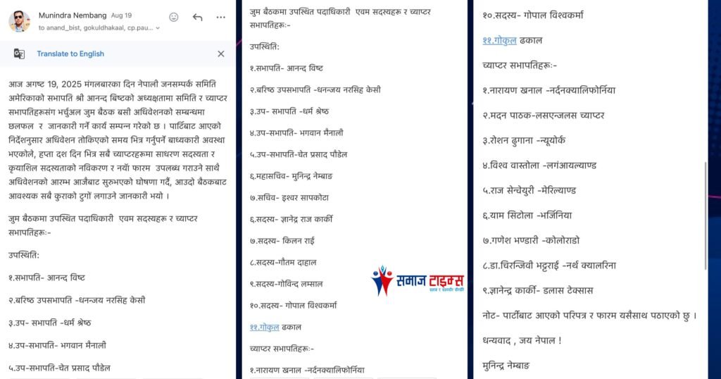 ‘पत्र आँको धेरै भयो यो एनआरएनएको निर्वाचनले सबैको ध्यान त्यतै गयो भन्ने कुरा मात्र भयो।‘ तीन सदस्यले भने, ‘रमाइलो पक्ष जनसम्पर्क समितिले ध्यान पुर्याएको भनिएको एनआरएनए अमेरिकाको निर्वाचनमा पछिल्लो दश वर्षमा पहिलो पटक कांग्रेस समर्थितले नेतृत्व गुमाएको छ।‘