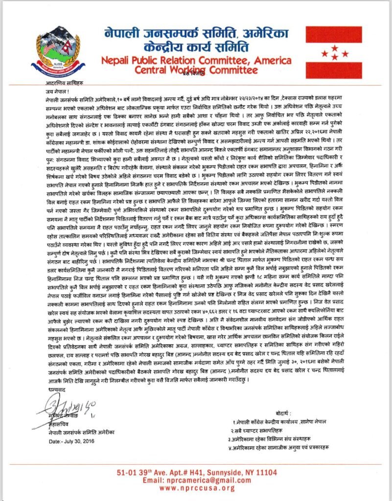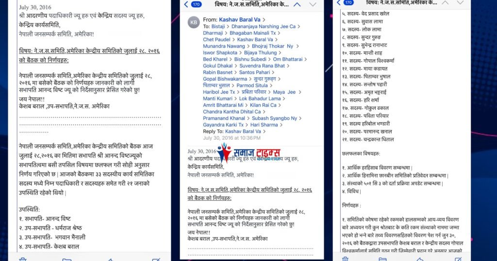 उनले बोलाएको बैठक पनि गणपूरक नभएको बताइएको छ। नेपाली जनसम्पर्क समिति अमेरिकाको कार्यसमिति ३५ सदस्यीय छ। तर मंगलवारको बैठकमा ११ जना मात्र उपस्थिति थिए।