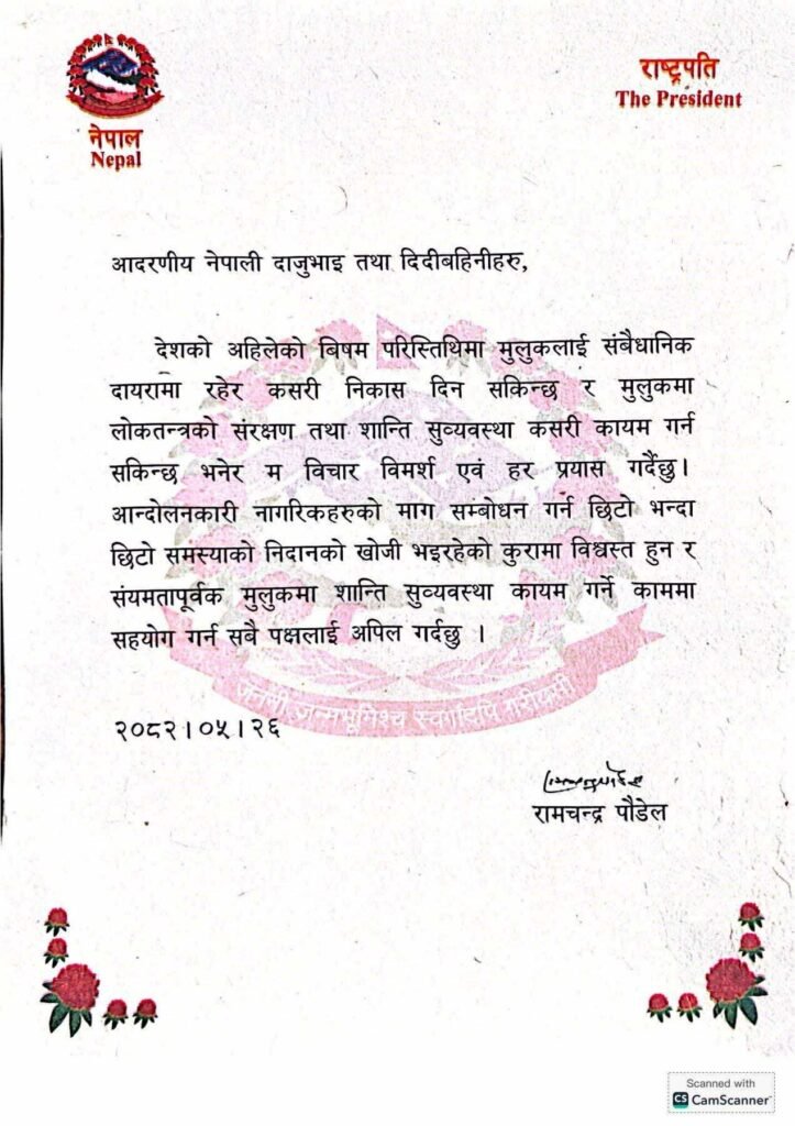 आदरणीय नेपाली दाजुभाइ तथा दिदीबहिनीहरू, देशको अहिलेको विषम परिस्थितिमा मुलुकलाई संवैधानिक दायरामा रहेर कसरी निकास दिन सकिन्छ र मुलुकमा लोकतन्त्रको संरक्षण तथा शान्ति सुव्यवस्था कसरी कायम गर्न सकिन्छ भनेर म विचार विमर्श एवं हर प्रयास गदै छु । आन्दोलनकारी नागरिकहरूको माग सम्बोधन छिटो भन्दा छिटो समस्याको निदानको खोजी भइरहेको कुरामा विश्वस्त हुन् संयततापूर्वक मुलुकमा शान्ति सुव्यवस्था कायम गर्ने काममा सहयोग गर्न सबै पक्षलाई अपिल गर्दछु ।