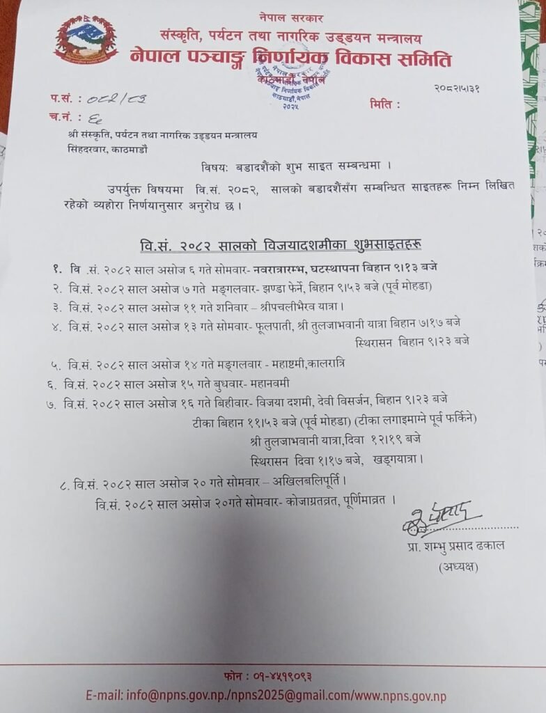 समितिले आज जारी गरेको सूचना अनुसार यस वर्षको बडादशैं २०८२ सालको असोज ६ गतेदेखि सुरु हुदैँछ । त्यस दिन बिहान ९ बजेर १३ मिनेटमा घटस्थापनाको साइत रहेको छ ।