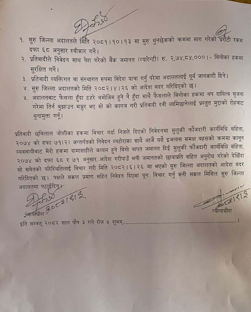 उच्च अदालतले थप एक करोड रुपैयाँ धरौटी राख्नसमेत आदेश दिएको छ ।