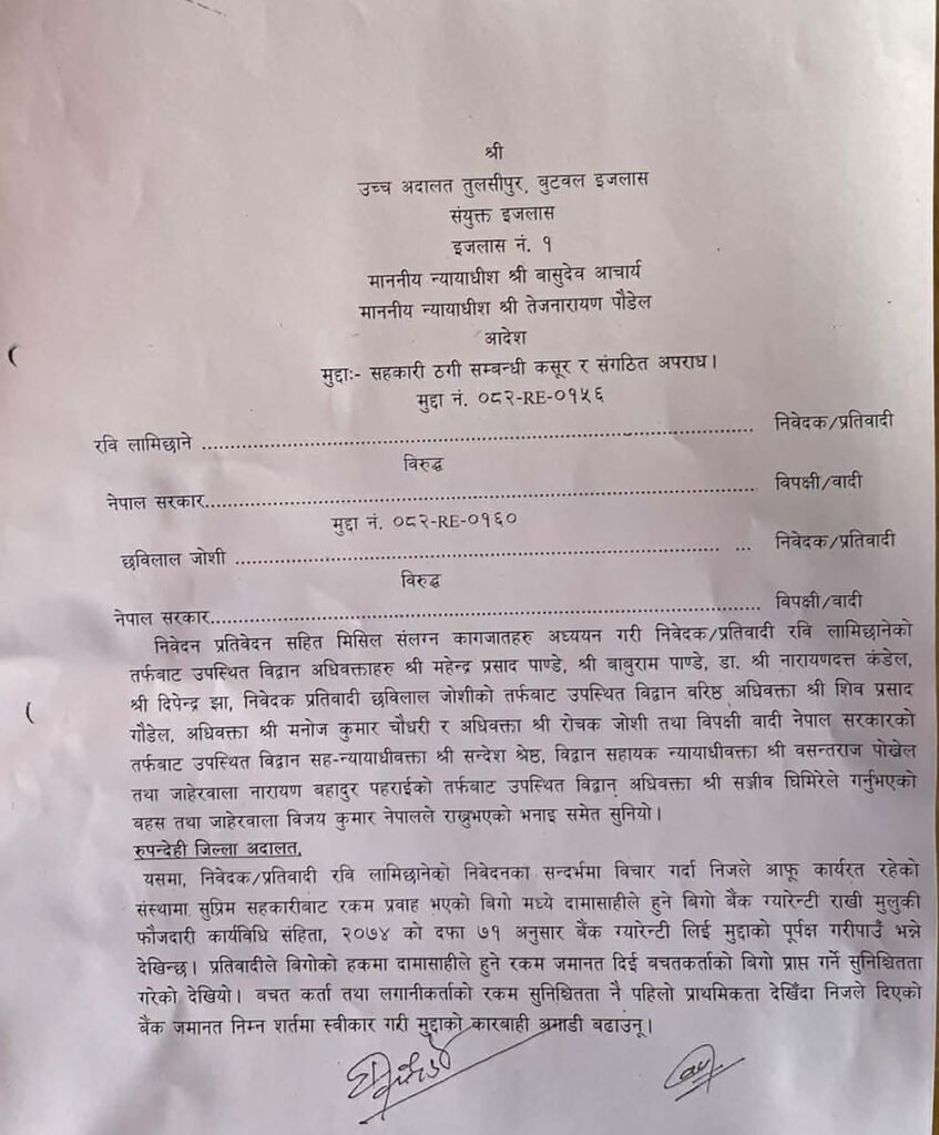 बिहीबार उनलाई उच्च अदालत बुटवलका न्यायाधीश बाबुदेव आचार्य र तेज नारायण पौडेलको संयुक्त इजलासले धरौटीमा रिहा गर्न आदेश दिएको हो ।