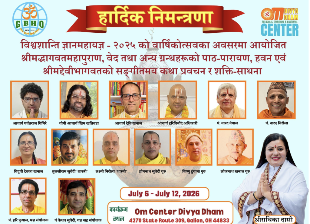 गालियन, ओहायो (अमेरिका) – विश्वभर छरिएका सनातन धर्मावलम्बी तथा नेपाली जाति–नेपालीभाषी समुदायलाई लक्षित गर्दै आध्यात्मिक ऊर्जा, शान्ति र सांस्कृतिक जागरणको सन्देश बोकेको ऐतिहासिक धार्मिक महोत्सव अमेरिकाको ओहायो राज्यस्थित ओम सेन्टर दिव्य धाममा आयोजना हुने भएको छ।