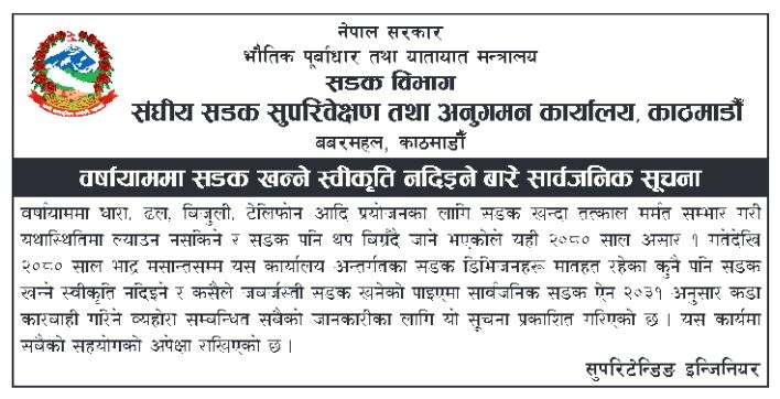 १ असारदेखि भदौ मसान्तसम्म सडक खन्न प्रतिवन्ध