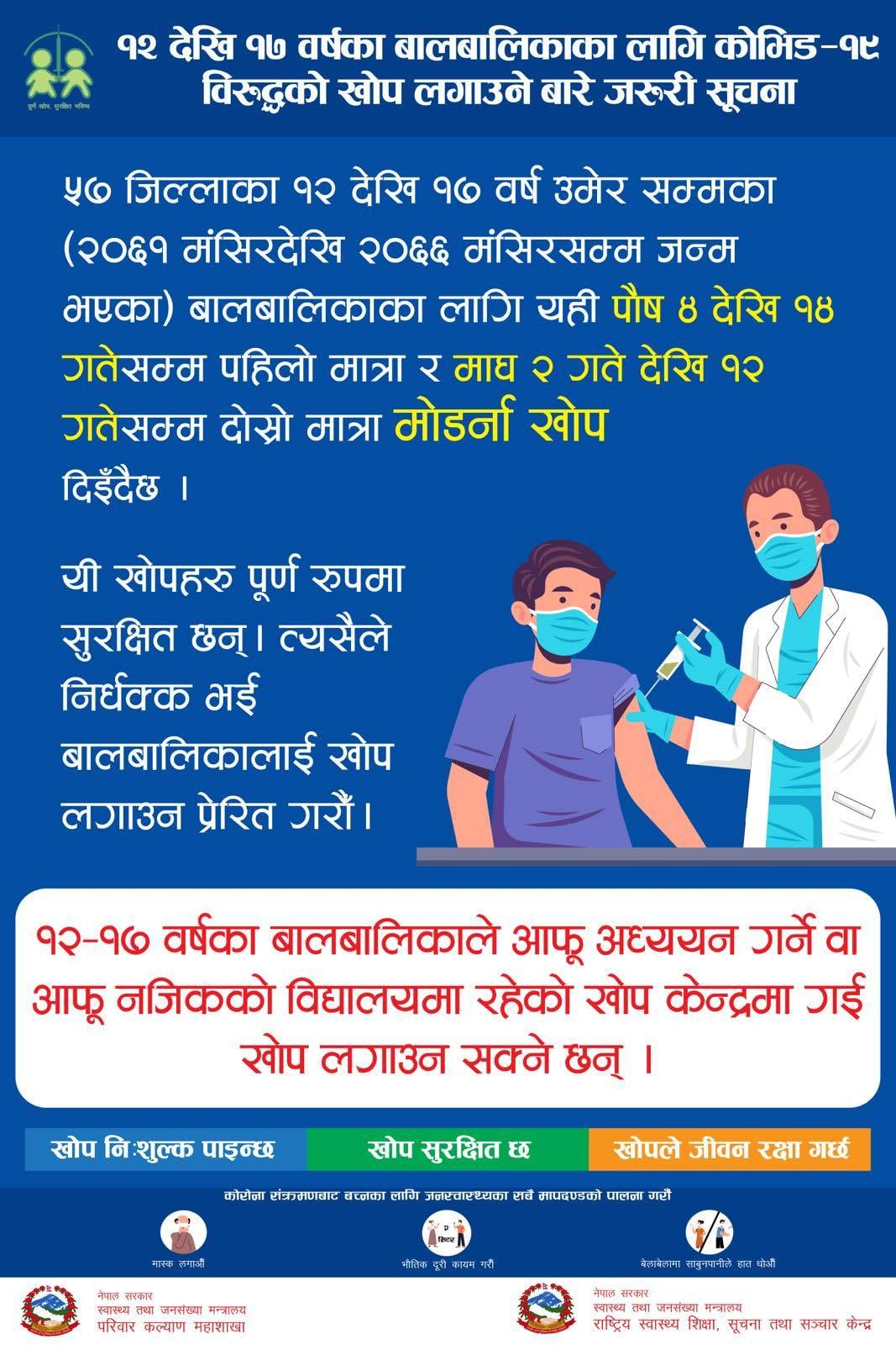 उपत्यकामा आजबाट १२ देखि १७ वर्ष उमेर समूहका बालबालिकालाई कोभिडविरुद्धको मोर्डना खोप लगाउन सुरु